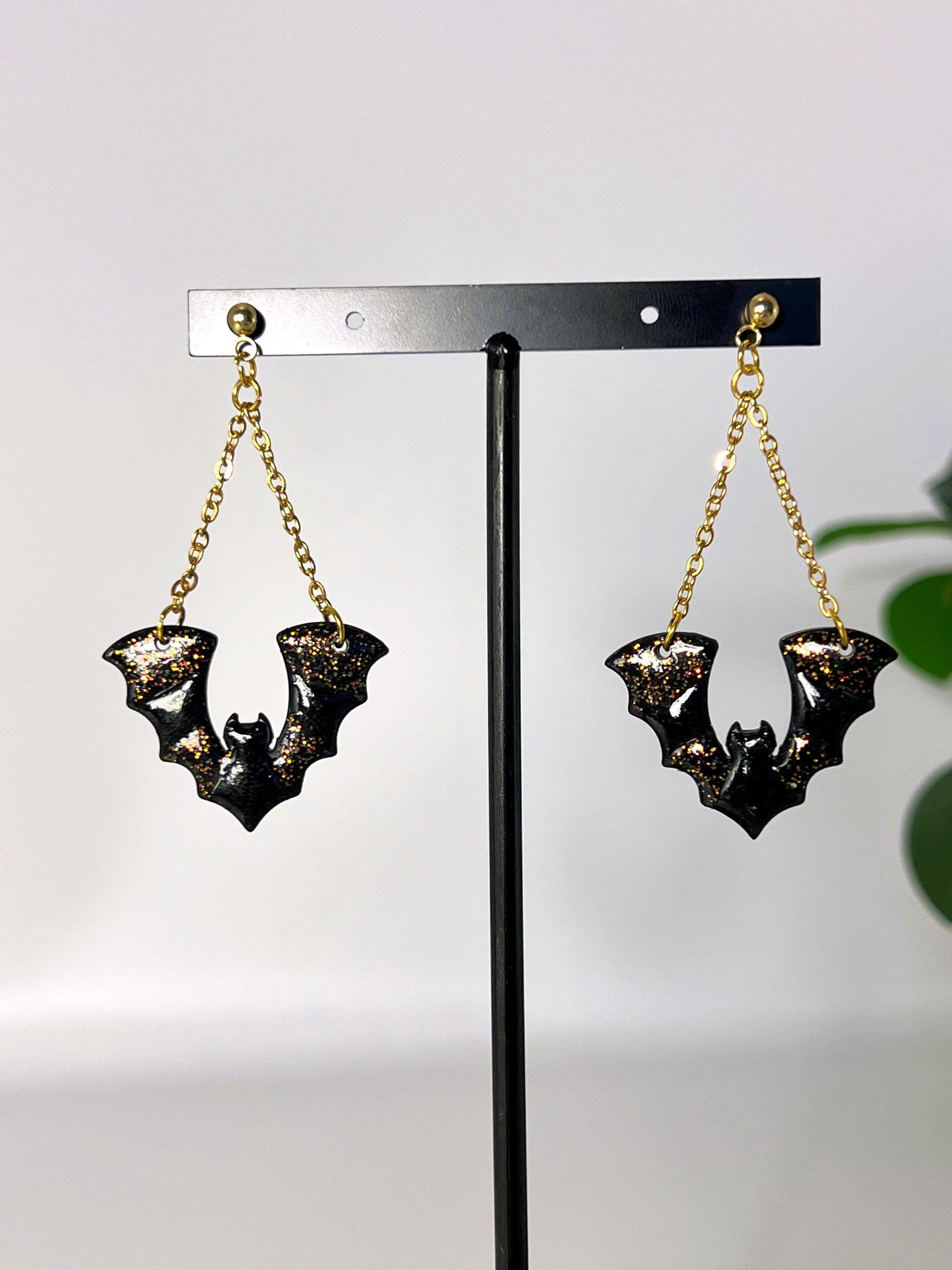 It's freakin' bats! The best way to get into the spooky season or just show your love of these cuties year round. These sweet little bats dangle from chain in your choice of color, letting them fly freely as you move around. Choose between classic matte or shimmery orange/green shift finish. Measures approximately 2.45" long x 1.3" wide overall from widest points.