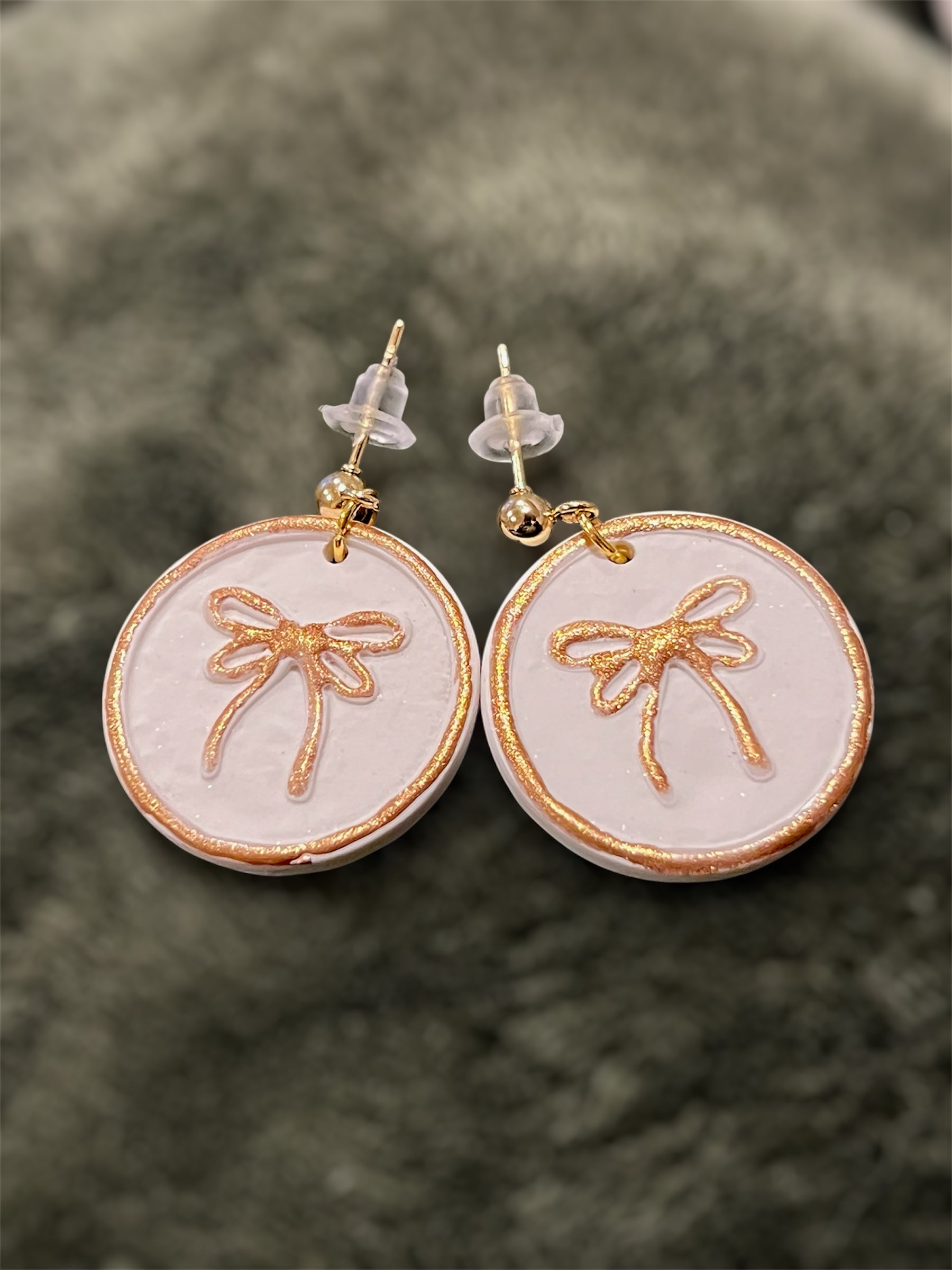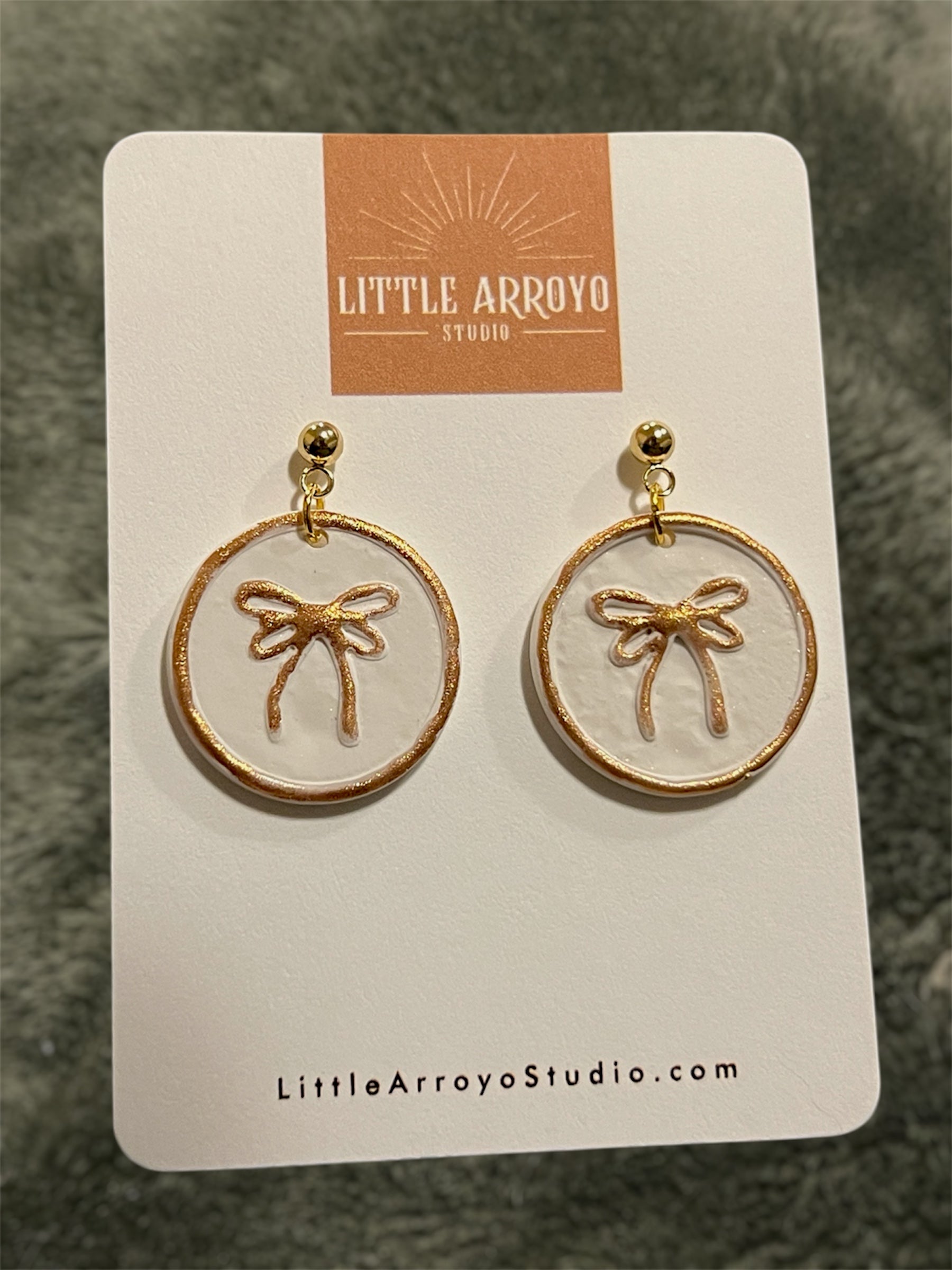 These dainty bows are femme, glitzy, and perfectly coquettish. Creamy background lets the debossed gold shimmer stand out. Measures approximately 1.25“ long and 1“ wide, including hardware.